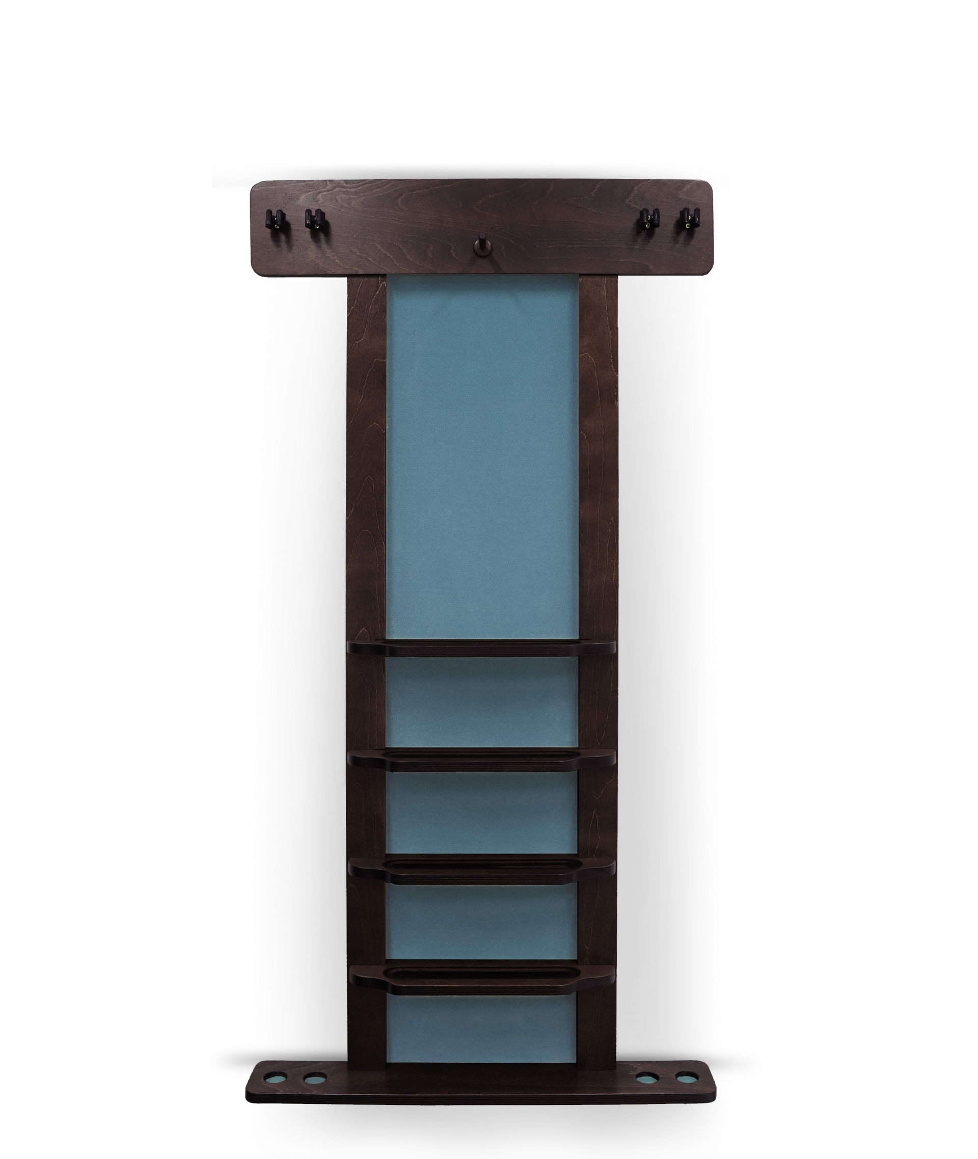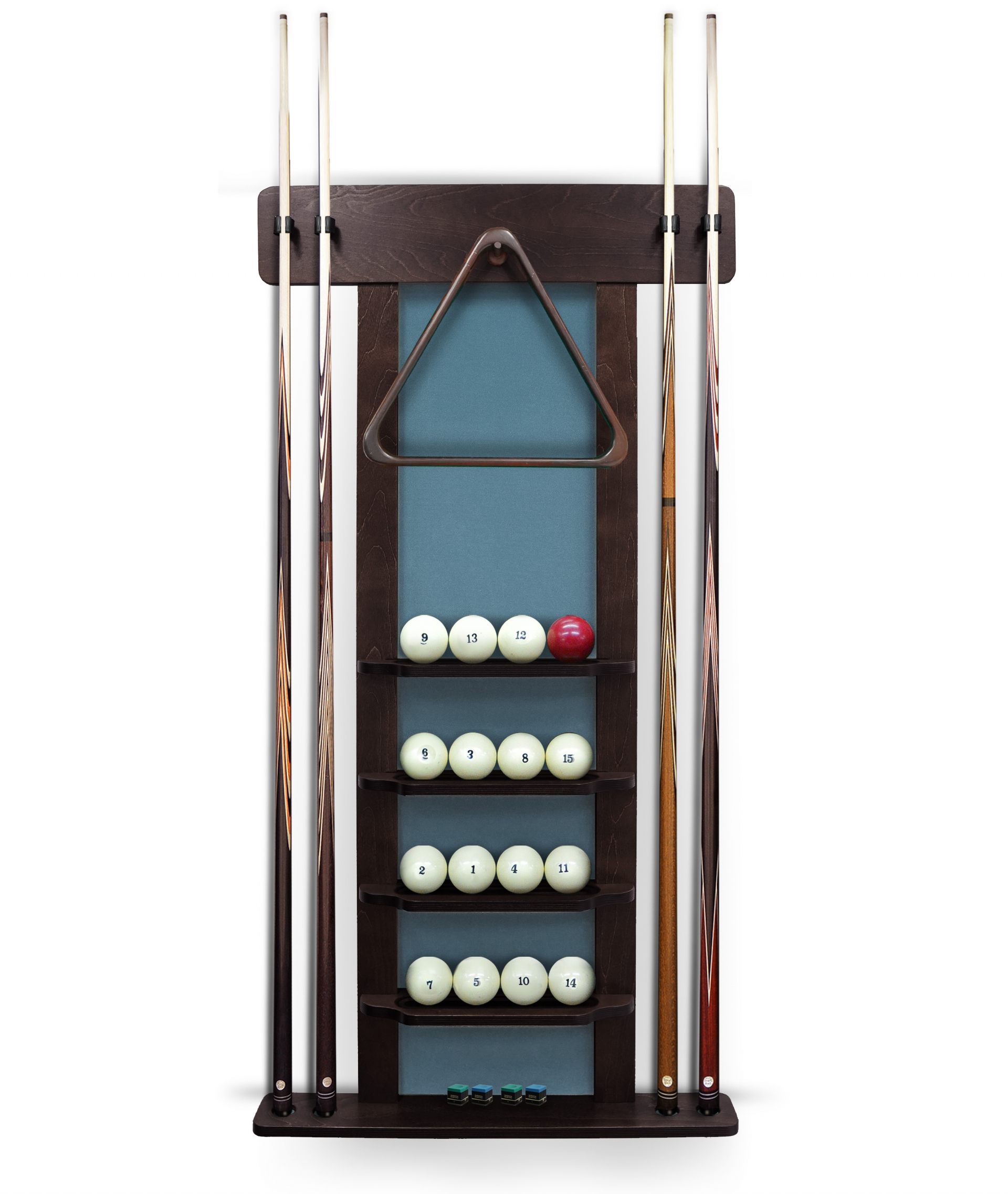 Модель изготовлена из высококачественной фанеры, обеспечивающей прочность и долговечность. Стенка и внутренние отделения для установки киев выстланы сукном, которое надежно фиксирует кии и бережно защищает шары от сколов и царапин.